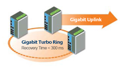 Turbo Ring (Гігабіт Турбо Кільце), що дозволяє системі мати зручні засоби управління і підвищує її надійність функціонування. З Gigabit Turbo, якщо відбудеться відключення будь-якого сегменту мережі, ваша система автоматизації через 20 мс буде знову функціонувати нормально. MOXA EDS-510A має 3 Gigabit порти - 2 Gigabit порти використовуються для створення MOXA Gigabit Ethernet Turbo Ring і