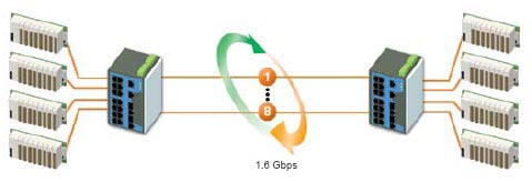 IEEE 802.3ad (LACP, Link Aggregation Control Protocol - керуючий протокол агрегації з'єднання), забезпечує гнучкі мережеві зв'язки і резервний шлях для критичних випадків. MOXA EDS-510A дозволяє агрегувати до шести паралельних зв'язків - максимум вісім портів для кожного зв'язку - для оптимальної і гнучкої мережевої взаємодії. Якщо один з восьми портів виходить з ладу, інші сім портів підтримають і перерозподілять трафік автоматично. LACP змінить інформацію так, щоб незалежні порти можна було визначати в обраній групі.