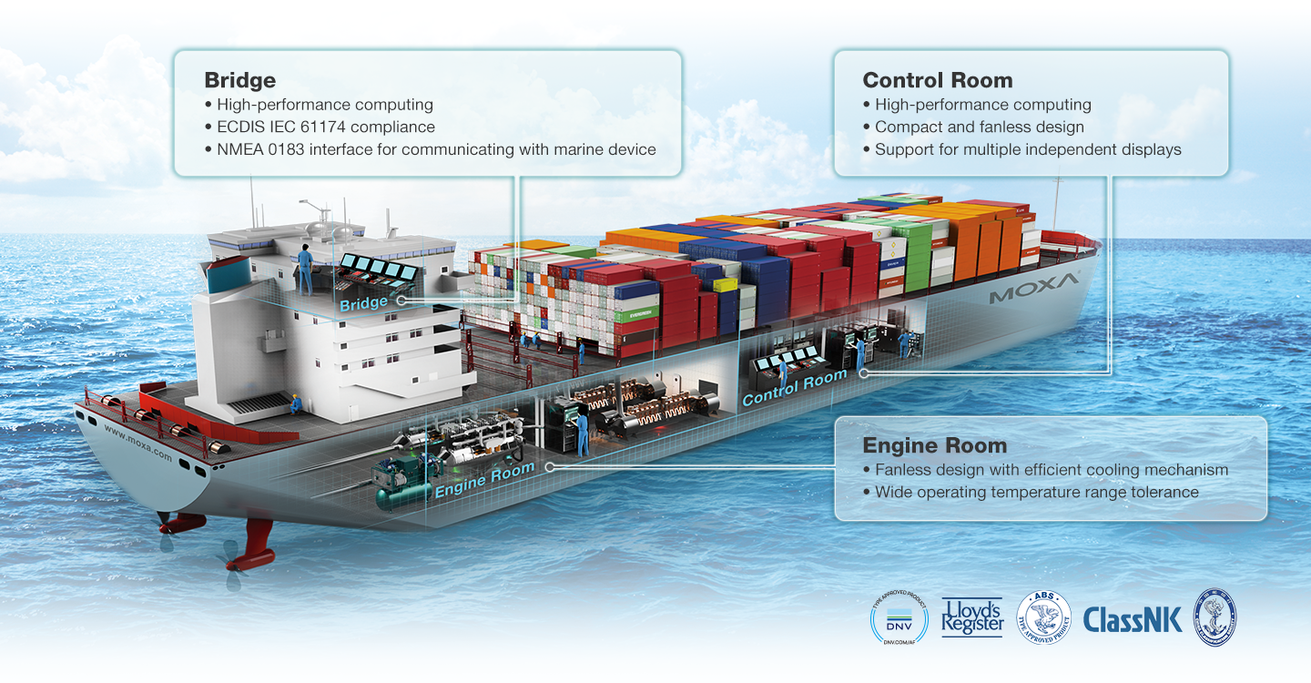 Moxa надає морським професіоналам промислові морські комп’ютери, панельні ПК, дисплеї та комутатори Ethernet, які використовують провідні технології та надійні конструкції, ідеальні для застосування на мостику, в диспетчерській або машинному відділенні. Морські рішення Moxa проходять суворі випробування та відповідають промисловим стандартам, щоб забезпечити відповідність міжнародним морським стандартам, таким як DNV, LR, ABS, NK, CCS, IEC 60945 та IACS E10.