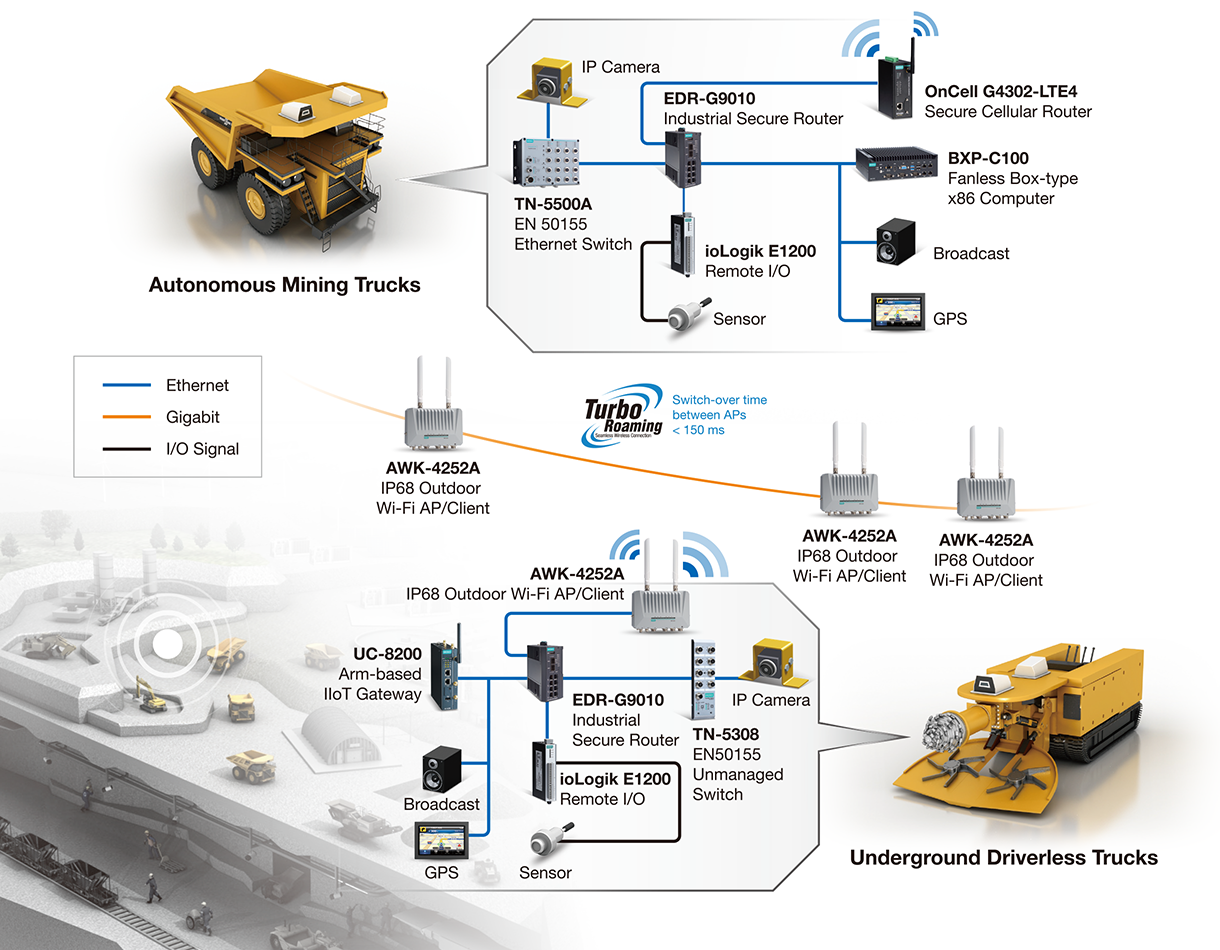 Надійна автоматизація гірничодобувної промисловості залежить від стабільності мереж зв'язку. Будучи лідером у галузі периферійних підключень, промислових обчислень та мережевої інфраструктури, Moxa має більш ніж 37-річний галузевий досвід. Наші новаторські технології та надійні рішення визнані у всьому світі та успішно застосовуються на рудниках по всьому світу. Наша сфера діяльності охоплює широкий спектр гірничодобувних операцій, включаючи автономні транспортні засоби, керування автопарком, підземні розробки, моніторинг довкілля, керування процесами та інтеграцію гібридних систем керування живленням для відновлюваних джерел енергії та систем акумуляторного зберігання енергії (BESS).