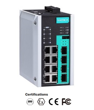 12-портовий керований Gigabit Ethernet комутатор, 8 10/100/1000BaseT PoE/PoE+ портів, 4 Gigabit SFP слоти, робоча температура від -40 до 75°C |