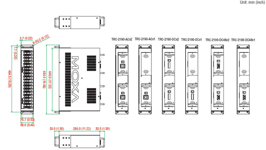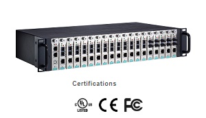 | Серія шасі TRC-2190 забезпечує 18 слотів для установки модулів медіаконвертерів з серії Ethernet-оптика CSM-400. Шасі також підтримують SNMP/веб-консоль для віддаленого управління і моніторингу. Шасі TRC-2190 поставляється з одним джерелом живлення змінного або постійного струму і з опціональним модулем живлення, доступним для підвищення надійності. Модулі живлення шасі TRC-2190 мають безвентиляторний дизайн і діапазон робочих температур від