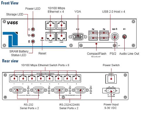 Серія V466 x86 вбудовуваний комп'ютер з VGA, 4*LAN, 4 Serial порти, 8 Switch портів, CompactFlash, 4*USB