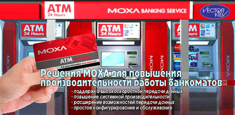 MOXA забезпечує численні рішення для розширення числа послідовних портів, а також щодо впровадження вбудованих комп'ютерів для банкоматів. Застосовуючи продукцію MOXA, розробники отримують інструментальні засоби, які можуть задовольнити попит на розширені послуги в банкоматах і забезпечать необхідну їх безпеку.