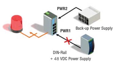 EDS-P308 має два входи для підключення незалежних джерел живлення. Якщо один з них перестає працювати, то другий автоматично забезпечує працездатність