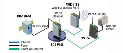 MOXA забезпечує повне сімейство рішень для пристроїв з підтримкою IEEE802.3af PoE. EDS-P308 і SPL-24 (PoE сплітер), можуть бути використані для спрощення дротових зв'язків при установці пристроїв. Пристрої можуть бути встановлені на відстані до 100 m від PSE.