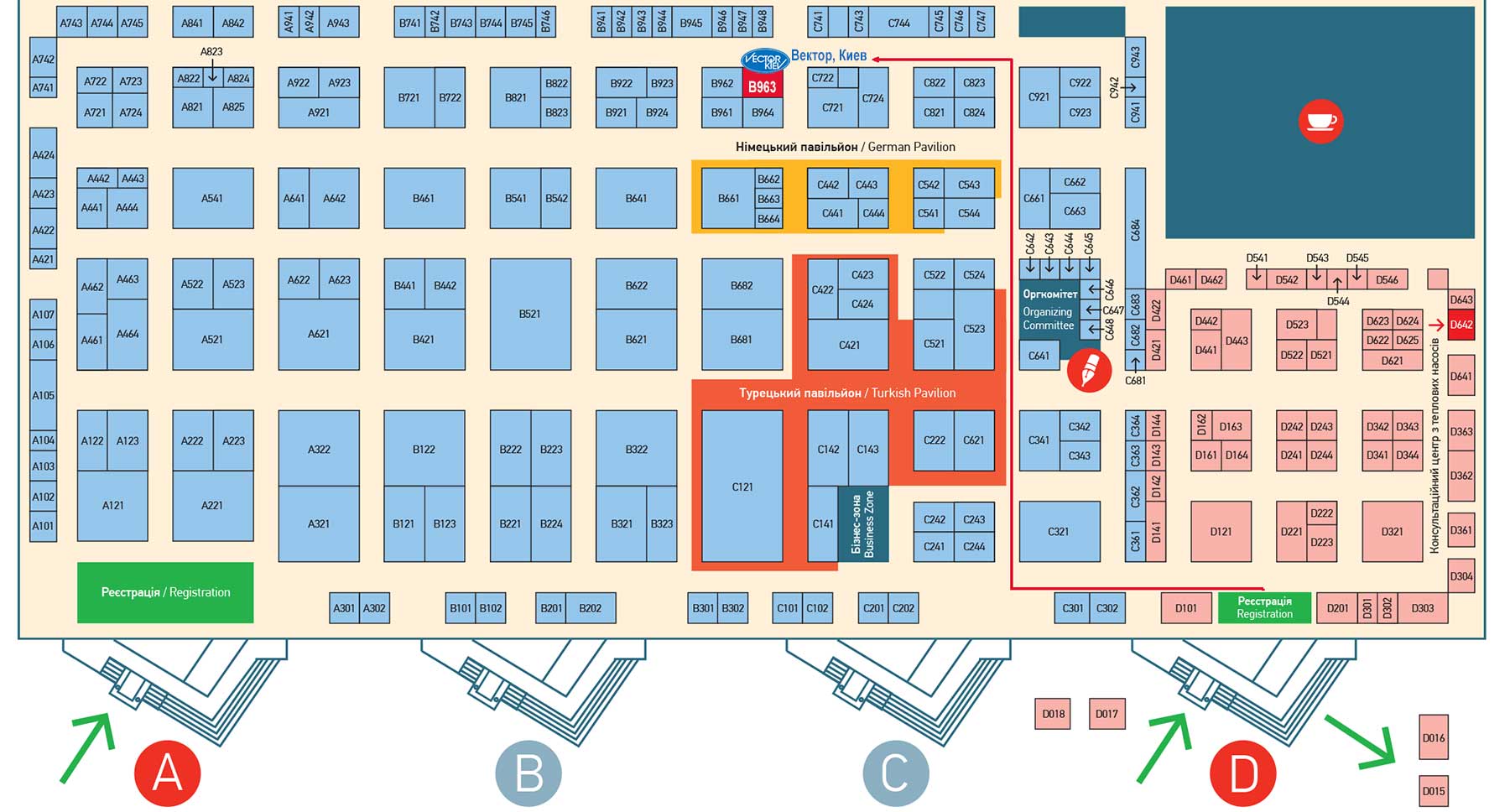 * На фрагменті схеми павільйону N1 стенд компанії "Вектор" Київ (B963) відзначений логотипом компанії, а також червоною стрілкою показаний прохід до стенду від стійки реєстрації учасників (Вхід D). |