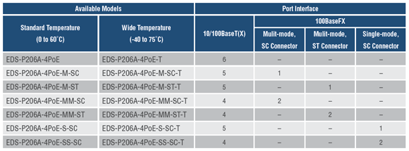 Некерований індустріальний Ethernet комутатор з 6 10/100BaseT(X) портами, 4 з яких 10/100BaseT(X) 802.3af (PoE) сумісні, робоча температура від -40 до 75°C |