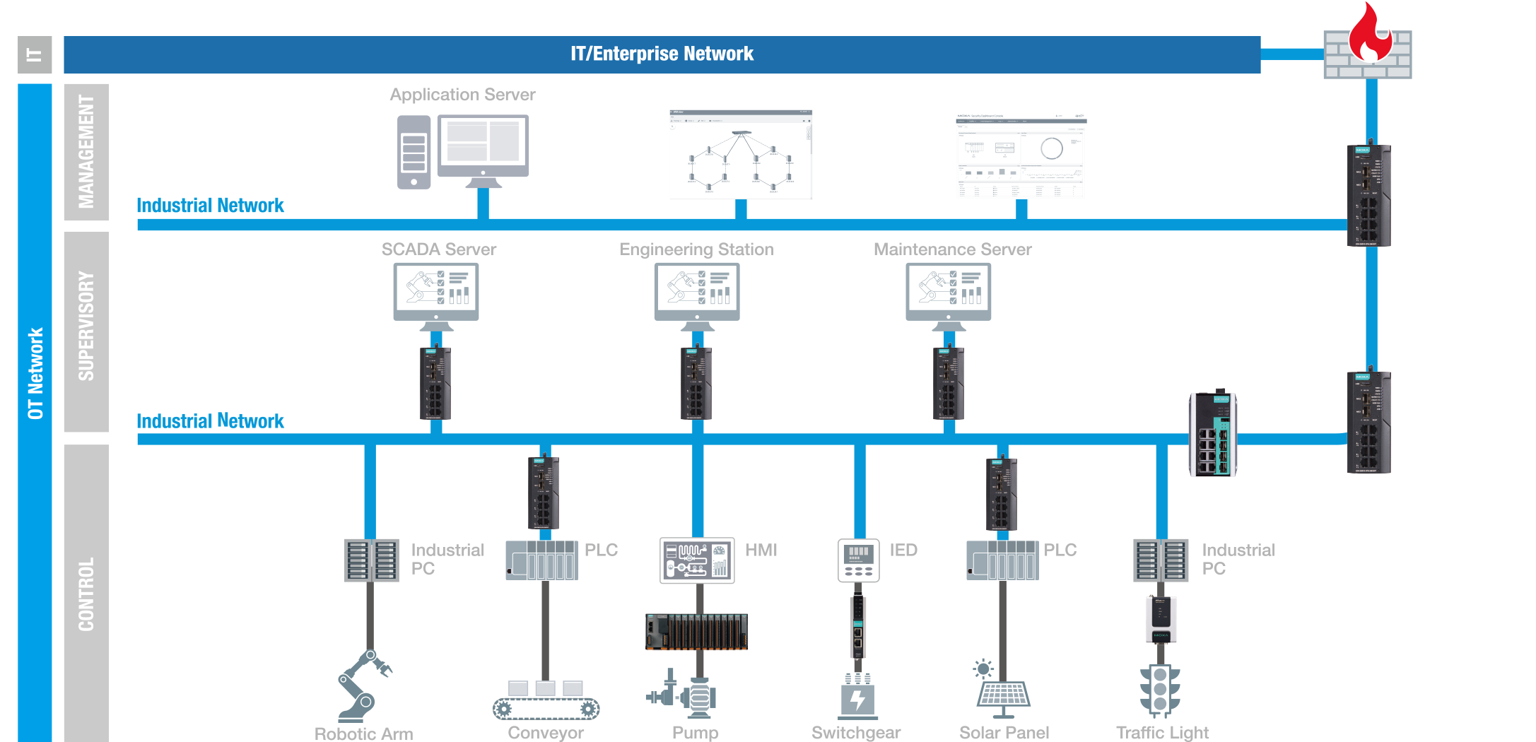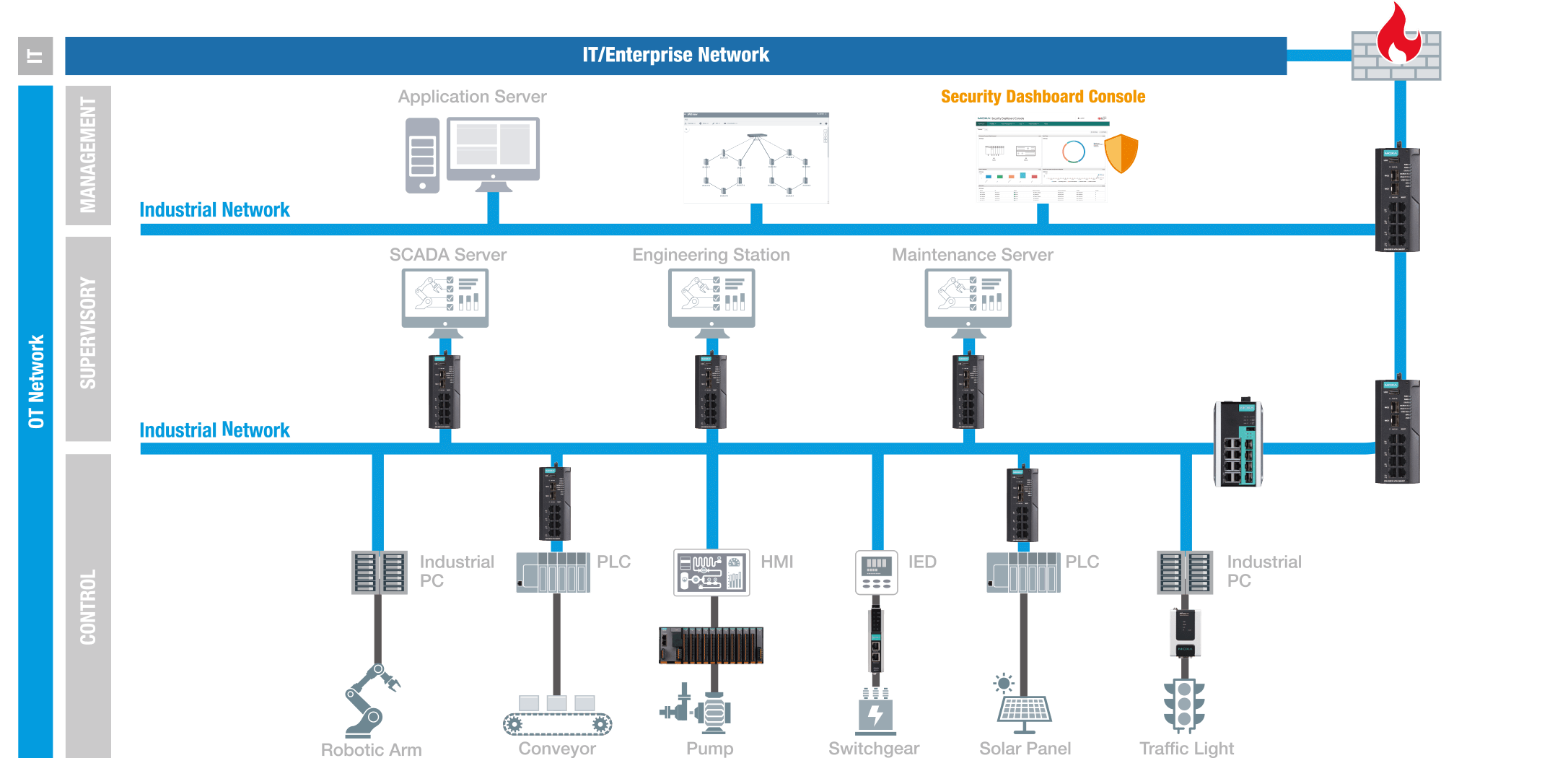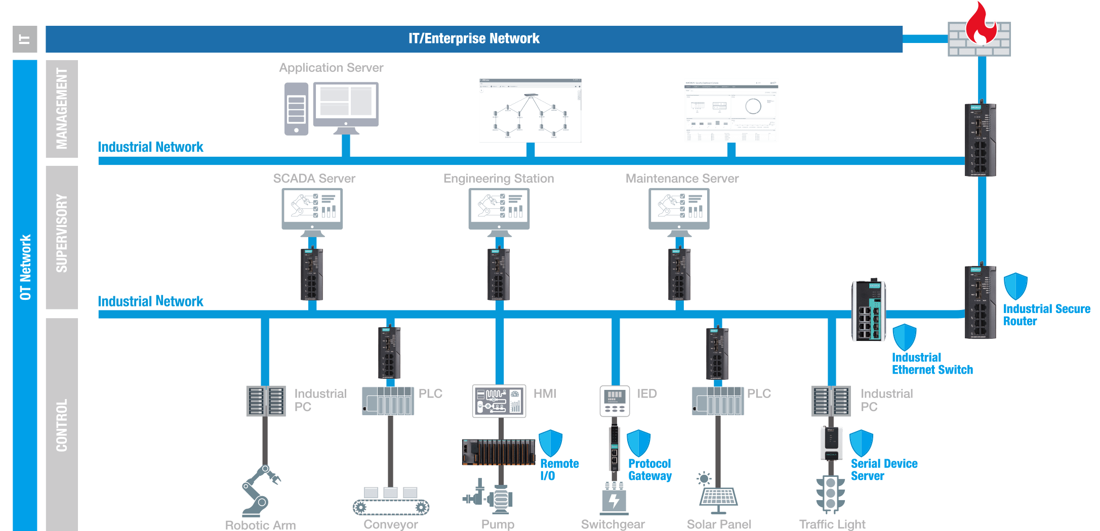 Щоб усунути розрив між світом OT та ІТ, Moxa пропонує скоординовані рішення, розроблені для повного захисту ваших промислових мереж.