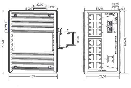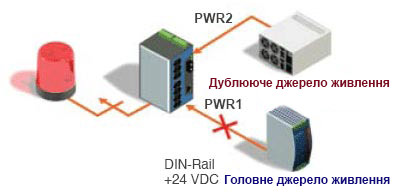 Резервоване вхідне живлення Серія MOXA EDS-316 має резервоване вхідне живлення - при пропаданні живлення від основного джерела вони автоматично переходять на живлення від дублюючого джерела.