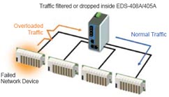 Будь-який пристрій в мережі не повинен мати необмежену ширину смуги пропускання, особливо коли це відбувається в результаті збою в роботі пристрою. Найбільш відома проблема в зв'язку з цим - це широкомовні "шторми", викликані установкою неправильної топології мережі або збоями в функціонуванні пристроїв. Серія MOXA EDS-408A / 405A може не тільки вберегти від широкомовних "штормів", але і також дозволяє правильно зконфігурувати діапазон unicast/multicast/broadcast пакетів, і таким чином, надати адміністратору повний контроль над шириною смуги, для того щоб вберегти мережу від перевантаження.