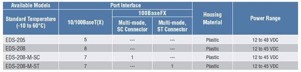 Широкий температурний діапазон (від -10 до 60 C) і DIN-Rail напрямні, дозволяють plug-and-play комутаторам MOXA EDS-208/205 дуже просто інтегруватися в індустріальні мережі і забезпечувати найоптимальніші рішення для промислових Ethernet додатків.