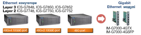 Серія Moxa IM-G7000 включає в себе модулі IM-G7000-4GTX і IM-G7000-4GSFP з можливістю гарячої заміни Gigabit Ethernet інтерфейсних модулів для Layer 3 індустріальних комутаторів серії МОХА ICS-G7848 / G7850 / G7852 і Layer 2 комутаторів серії ICS-G7748 / G7750 / G7752. За допомогою цих гнучких інтерфейсних модулів, модульні Ethernet комутатори серії ICS можуть забезпечити до 48 Gigabit Ethernet портів з мідним або SFP волоконно-оптичними з'єднувачами.