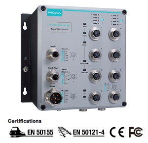 комутатори мають 8 Fast Ethernet M12 портів і 2 Gigabit Ethernet порти на нижньому боці корпусу з функцією релейного перемикання (TN-5510A-2GTXBP). MOXA TN-5510A мають розширений температурний діапазон від -40° до 75°C. Серія MOXA TN-5510 сумісна зі стандартами EN50155 - температура, захист від перешкод і вібрації, резервуване живлення - це економічно ефективний засіб для побудови надійних індустріальних мереж.