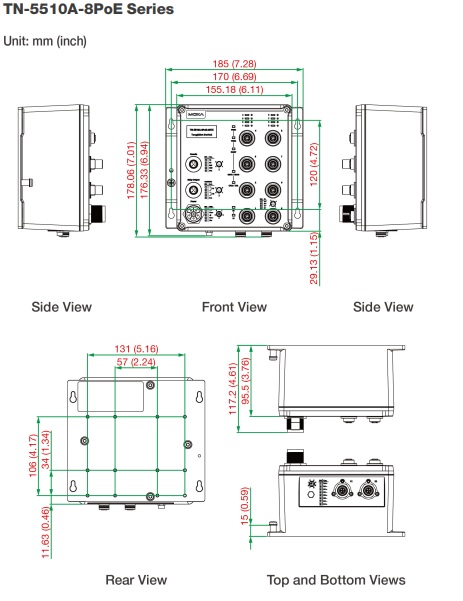 Комутатори серії MOXA TN-5510A-8PoE Ethernet мають 8 Fast Ethernet M12 портів, що підтримують IEEE 802.3 / 802.3u / 802 / 3x з 10 / 100M, full / half-duplex, MDI / MDI-X auto-sensing, сумісних зі стандартом IEEE 802.3at / af PoE (Power-over-Ethernet) і два Gigabit Ethernet інтерфейси з опціональною функцією релейного перемикання (bypass relay function, модель TN-5510A-8PoE-2GTXBP-WV-T). Комутатори MOXA TN-5510A-8PoE класифікуються як обладнання, що забезпечує живлення пристроїв (PSE - power source equipment) і здатні забезпечити до 30 Ватт на порт для заживлення таких пристроїв як відеокамери, бездротові точки доступу або IP телефони.