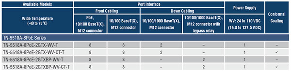 Комутатори серії MOXA TN-5518A-8PoE Ethernet мають 16 Fast Ethernet M12 портів, що підтримують IEEE 802.3 / 802.3u / 802 / 3x з 10 / 100M, full / half-duplex, MDI / MDI-X auto-sensing, 8 з яких сумісні зі стандартом IEEE 802.3at / af PoE (Power-over-Ethernet) і два Gigabit Ethernet інтерфейси з опціональнлю функцією релейного перемикання (bypass relay function). Комутатори MOXA TN-5518A-8PoE класифікуються як обладнання, що забезпечує живлення пристроїв (PSE - power source equipment) і здатні забезпечити до 30 Ватт на порт для заживлення таких пристроїв як відеокамери, бездротові точки доступу або IP телефони.