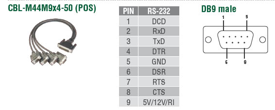 RxD, RTS, CTS, DTR, DSR, DCD, GND, RI (опціонально) |