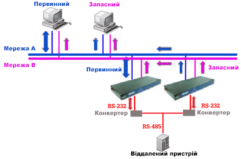MOXA CN2600 забезпечує підтримку до 4 IP адрес. На рисунку нижче - дані від віддаленого пристрою, через послідовний інтерфейс RS-485 і конвертори RS-485 в RS-232 надходять на два MOXA CN2600 (первинний і запасний) і можуть бути передані по 4 IP адресах в 2 хости (первинний і запасний) за допомогою двох мереж (LAN А і LAN В). Перший з 4 IP адрес є первинним IP і призначений для обміну даними з віддаленим пристроєм. Інші три IP адреси не можуть обмінюватися даними з віддаленим пристроєм. Відповідно до цієї архітектури, якщо первинний PC, LAN А чи первинний MOXA CN2600 стануть непрацездатними, то система може забезпечити безперебійне функціонування з використанням трьох інших альтернативних адрес, і не припинить свого функціонування. В даному прикладі використовується потрійне резервування - хостів, мереж і