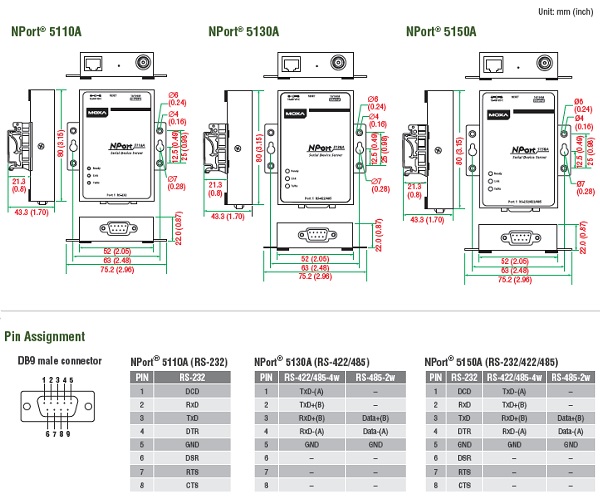NPort® 5130A: RS-422/485 NPort® 5150A: RS-232/422/485 |