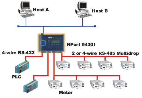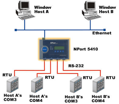 Різні хости (Host A і Host B) можуть розділяти один NPort 5400 для управління різними пристроями з послідовним інтерфейсом, підключеним до його портів. Наприклад, порти 1 і 2 NPort 5410 можуть бути налаштовані як COM3 і COM4 хоста А (Host A), а 3 і 4 порти NPort 5410 можуть бути налаштовані як COM3 і COM4 хоста