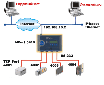 Для автоматичного або дистанційного контролю потоком даних пристрої NPort серії 5400 можуть забезпечувати підключення до 4 пристроїв з послідовним інтерфейсом по одній IP адресі. По заданій IP адресі та номеру TCP порту, хост комп'ютер може отримати доступ до всіх пристроїв з послідовним інтерфейсом через Internet. Наприклад, звернення до 192.168.10.2:4001 - це доступ до даних з першого послідовного порту
