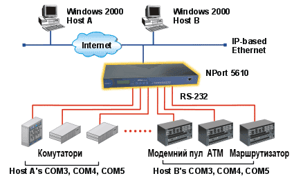 Різні хости (Host A і Host B) можуть розділяти один NPort 5610 для управління різними пристроями з послідовним інтерфейсом, підключеним до його портів. Наприклад, порти 1, 2, 3 NPort 5610 можуть бути налаштовані як COM3, COM4, COM5 хоста А (Host A), а порти 14, 15, 16 NPort 5600 можуть бути налаштовані як COM3, COM4, COM5 хоста В (Host B) , для створення розподіленої мережевої системи управління.