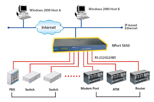 Різні хости (Host A і Host B) можуть розділяти один NPort 5650 для управління різними пристроями з послідовним інтерфейсом, підключеним до його портів. Наприклад, порти 1, 2, 3 NPort 5650 можуть бути налаштовані як COM3, COM4, COM5 хоста А (Host A), а порти 14, 15, 16 NPort 5650 можуть бути налаштовані як COM3, COM4, COM5 хоста В (Host B) , для створення розподіленої мережевої системи управління.