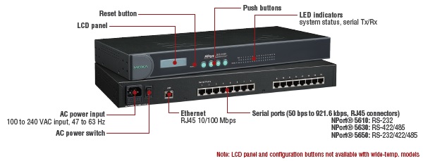 Світлодіодні індикатори Serial Tx/Rx і світлодіодні індикатори Ethernet на з'єднувальному роз'ємі дозволяють аналізувати проблеми і надають простий шлях моніторингу системи. Світлодіодні індикатори NPort 5650 не тільки вказують поточний стан системи, але і допомагають технічному персоналу контролювати статус підключених пристроїв з послідовним інтерфейсом.