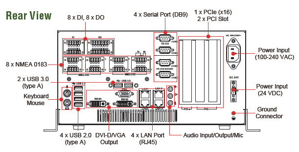 4 Gigabit Ethernet порти, 8 USB хостів, один PCI-e x 16 слот, 2 PCI слоти, інтерфейс для