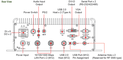 (M12 з'єднувачі), 2 Serial порти, VGA, DVI-D, Audio, 6DI, 2DO, 3*USB 2.0, CompactFlash,