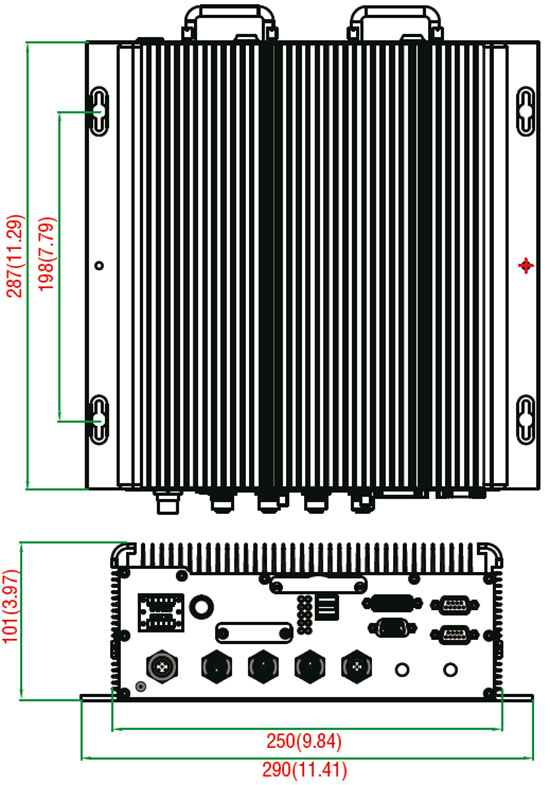 з 2 * LAN (M12 з'єднувачі), 2 Serial порти, VGA і DVI-D, Audio, 6DI, 2DO, 3 * USB 2.0,