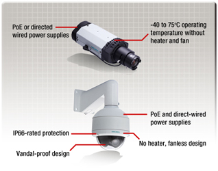 Робота без обігріву або охолодження дозволяє Moxa IP-камерам забезпечувати більш високу надійність при більш низькому енергоспоживанні, що значно спрощує їх електричну установку, а також і обслуговування системи відеоспостереження. Ці камери також сумісні з IEEE 802.3af PoE, тому вони можуть живитись тільки через Ethernet кабель. |
